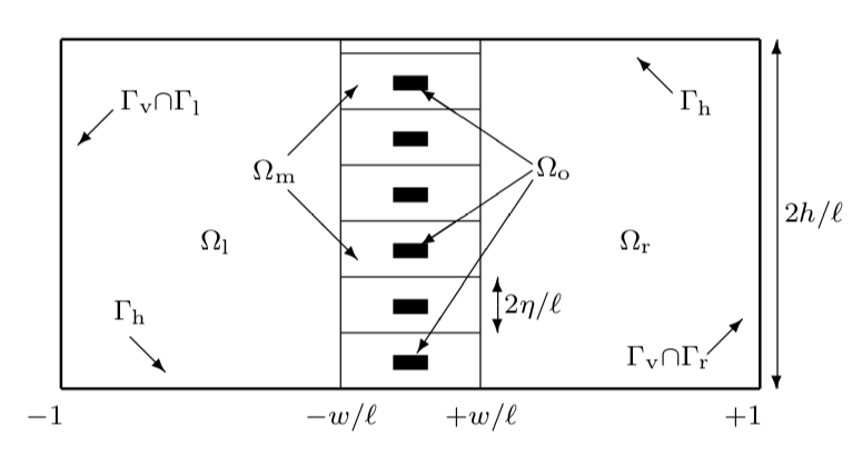 Figure 1: Schematic overview of the geometry. The filled bars in the center are impenetrable.